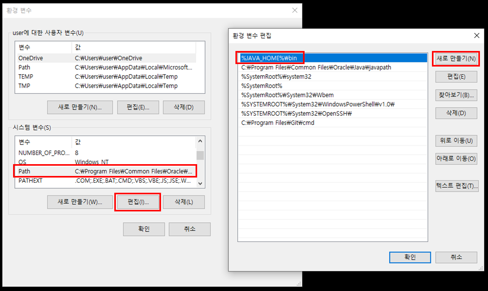 환경변수 창에서 'user에 대한 사용자 변수'에는 user에 대한 변수만 설정, '시스템변수'에는 모든 사용자에 대한 변수 설정