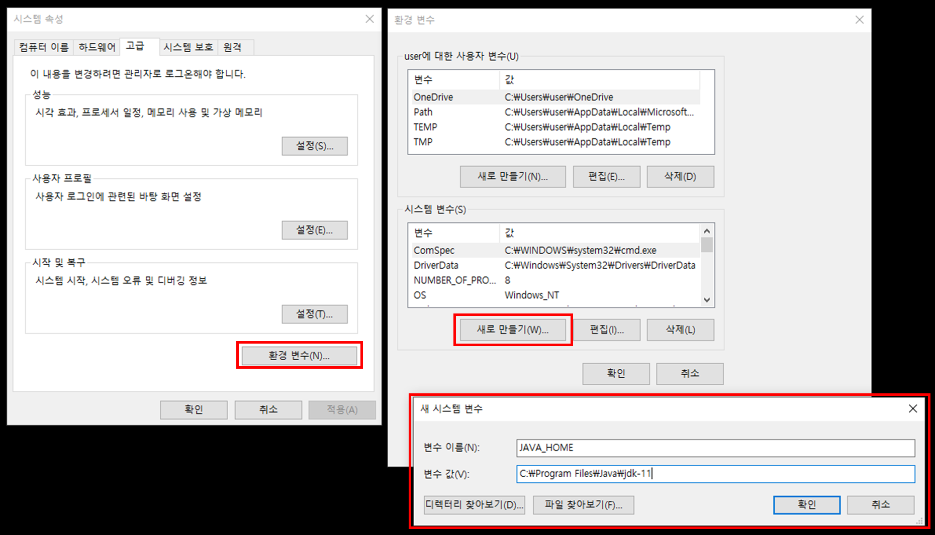 - 내PC > 속성 > 고급시스템설정 > 환경변수 > 새로 만들기 > JAVA_HOME 추가