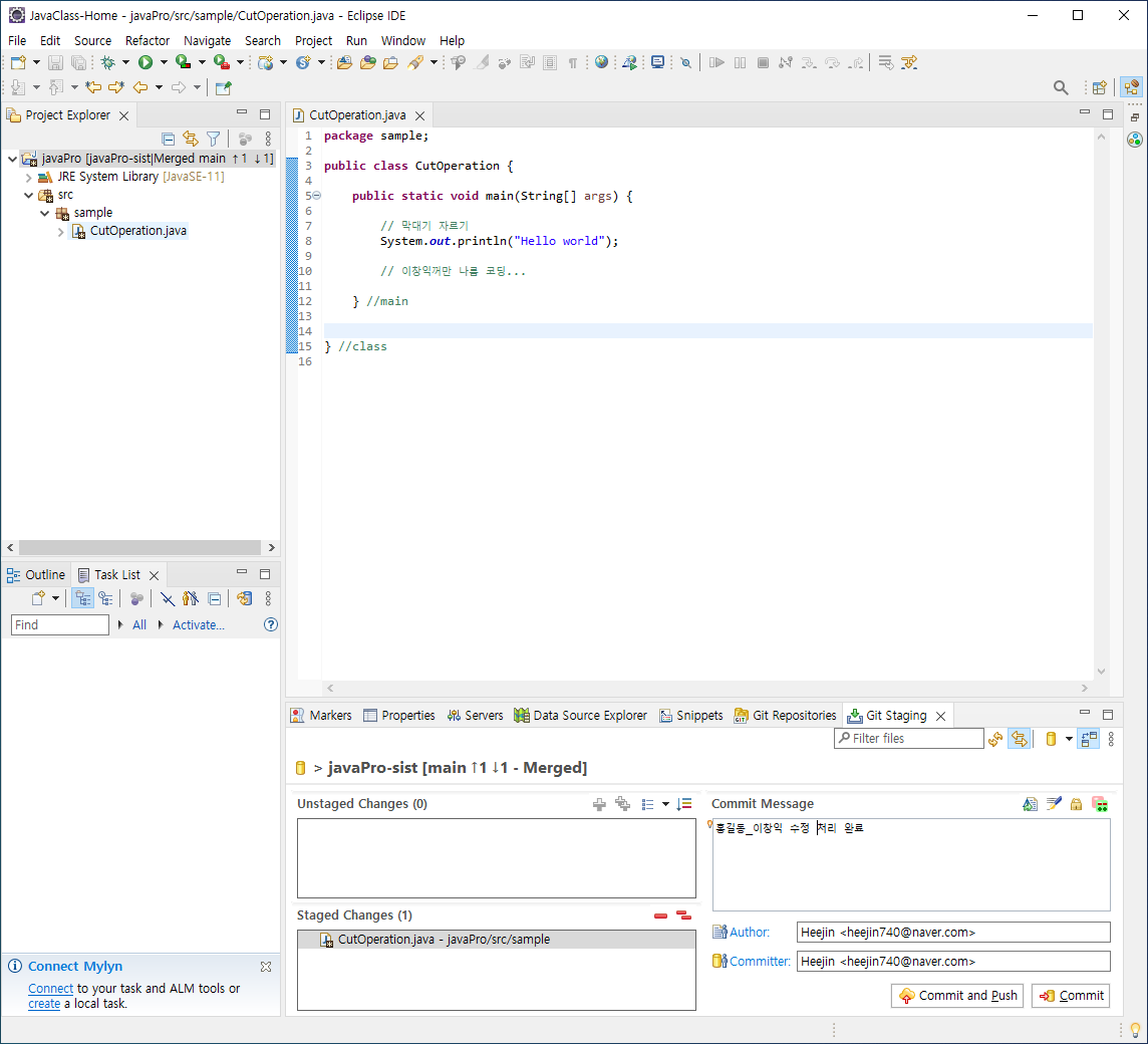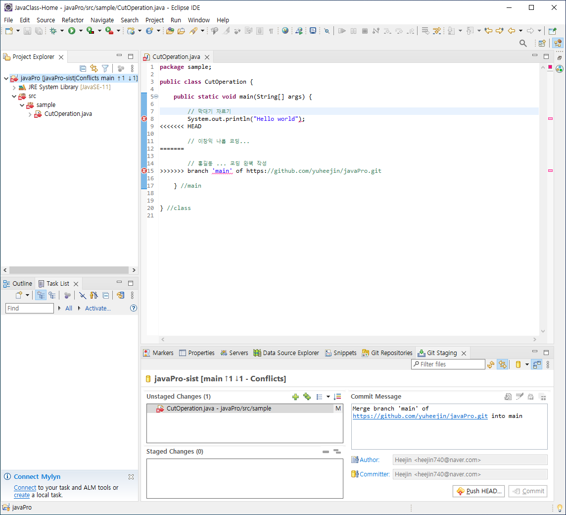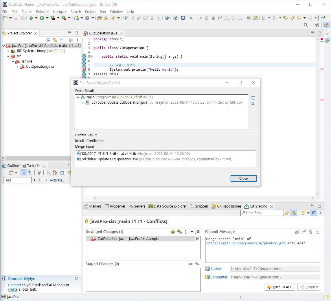 [ 집에서 커밋하는 것을 모르고 내 코드 추가해서 커밋 할 경우 ]