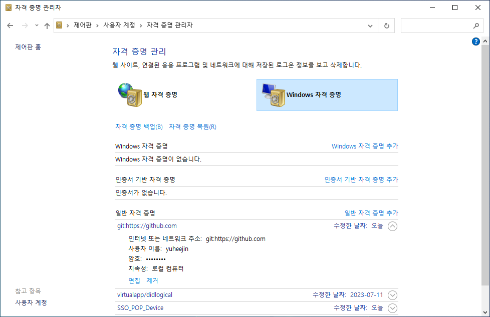 아래 자격증명관리자에서 편집 혹은 제거해서 재설정