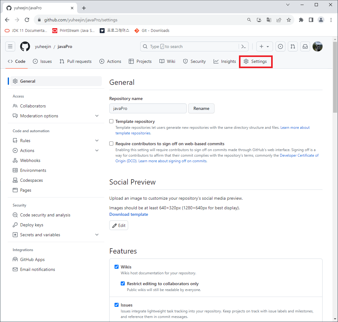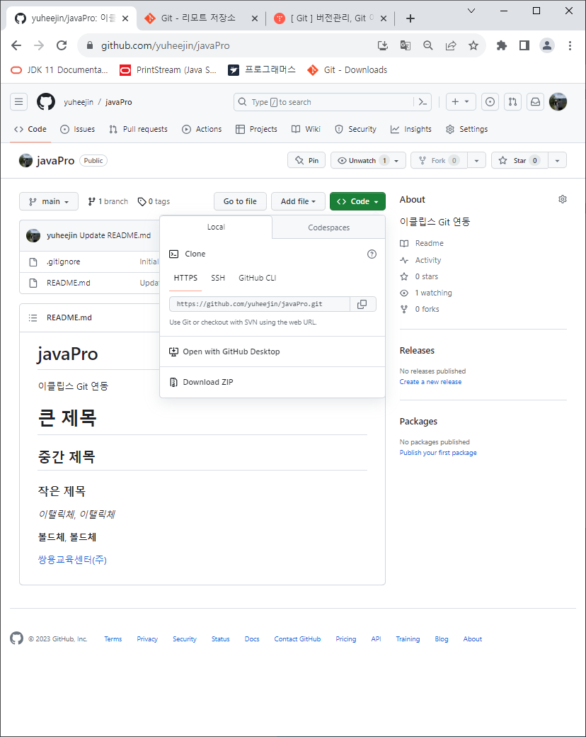 git 서버를 운영하기에 부담스러울 수 있다. 그렇기 때문에 git 호스팅 서비스의 일종인 GitHub를 많이 사용한다. 1. GitHub https://github.com/ GitHub: Let’s build from here GitHub is where over 100 million developers shape the future of software, together. Contribute to the open source community, manage your Git repositories, review code like a pro, track bugs and fea... github.com 2. github 저장소 생성 후 ' code' > https 링크 복사 3. 깃 연결할 워크스페이스 오..